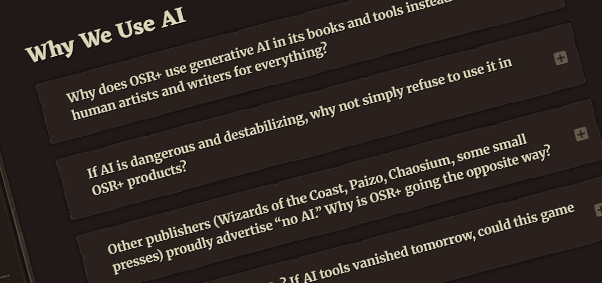 Even simple, out-of-box implementations of AI tools into analog processes can rapidly accelerate workflows. Advanced Old School Revival leveraged Google’s NotebookLM to cross-reference thirty, 300-page manuals all at once, which made building its own manuscript based on the most popular entries in those manuals realizable by a single game designer.